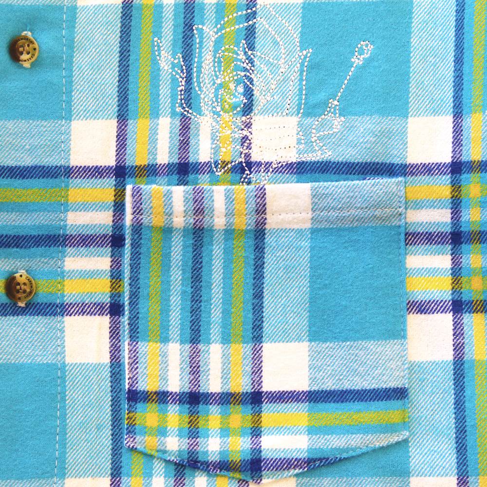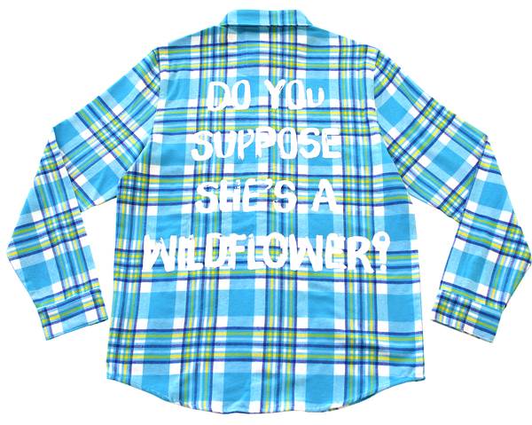 The cozy blue flannel is inspired by Alice’s dress and the flower garden scene. The back features the quote “Do you suppose she’s a wildflower?” The front includes embroidered details of Alice’s signature on the collar and a rose from the flower garden on the pocket.