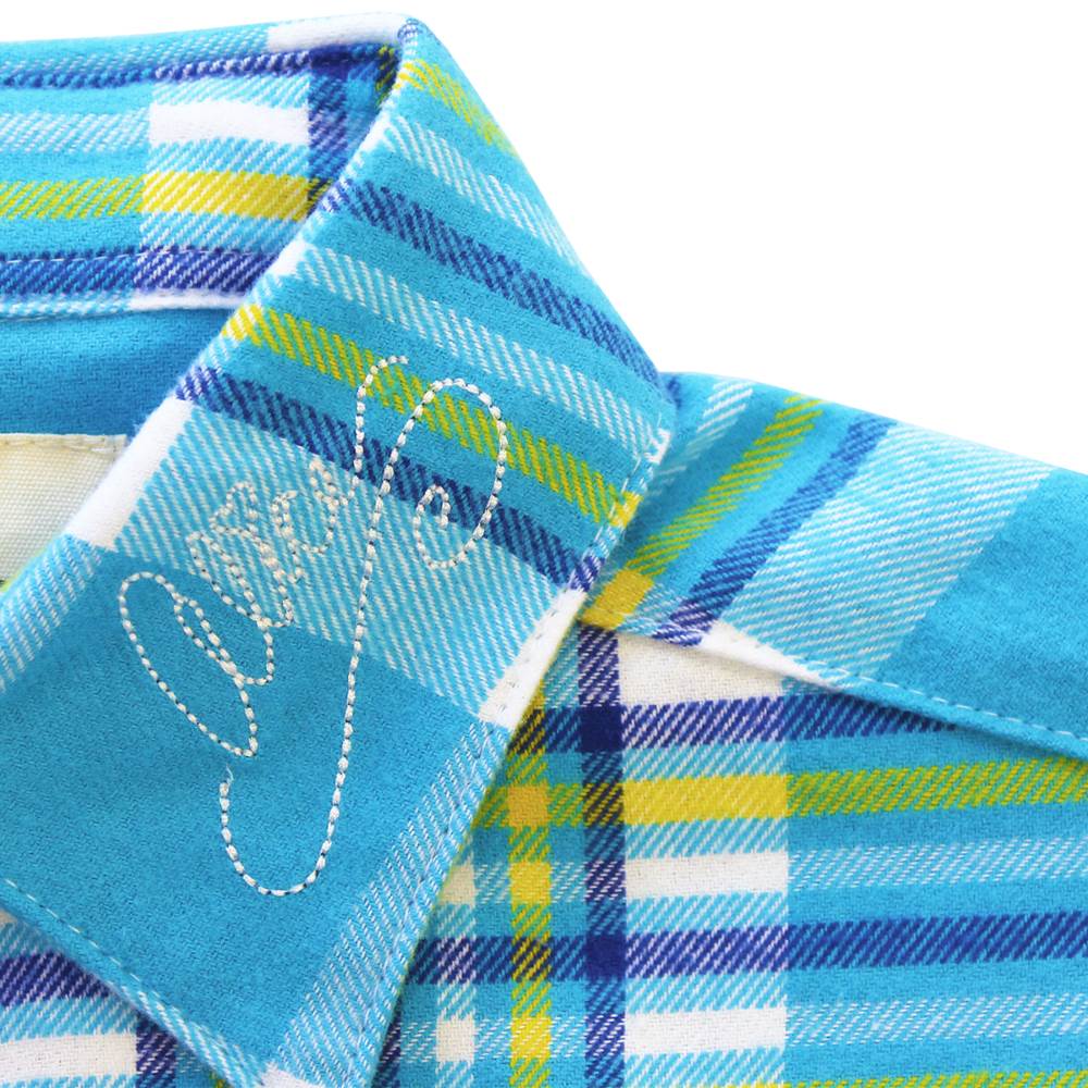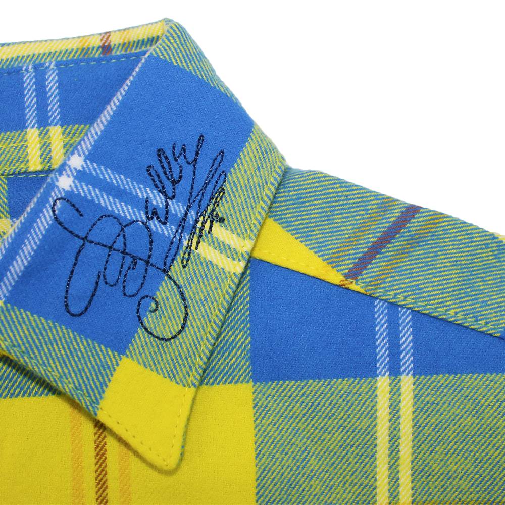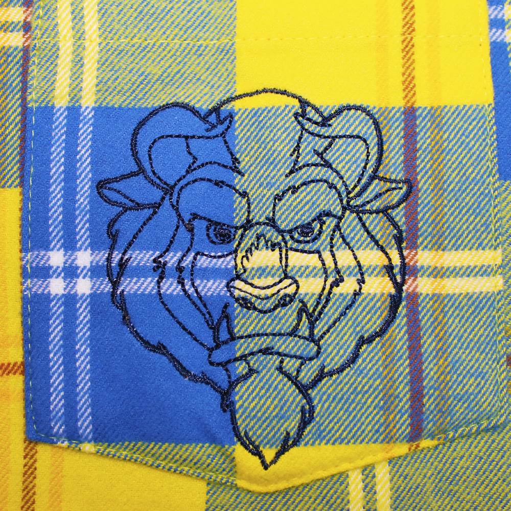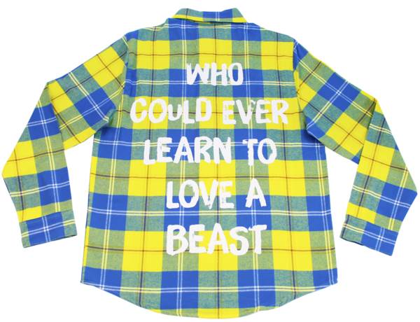 “Inspired by Belle’s dresses, this yellow and blue flannel features one of her quotes from the film, ‘Who could ever love a beast’ on the back and embroidered details on the front.”