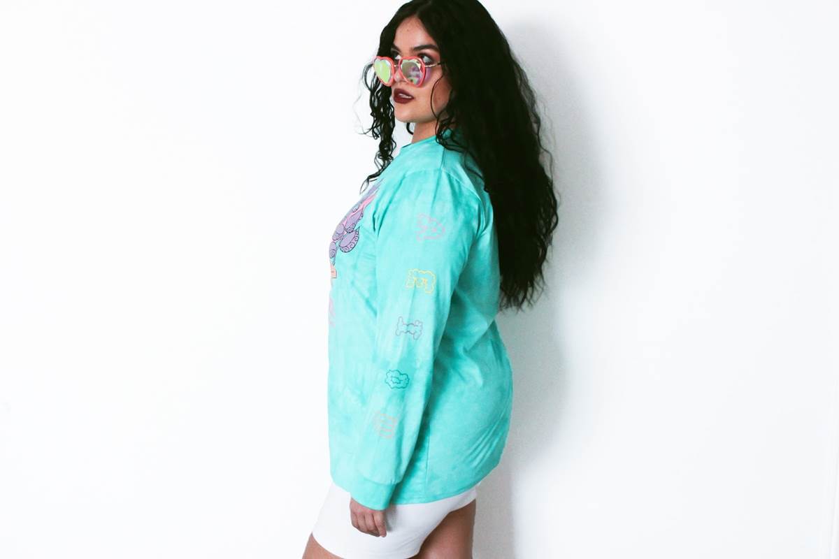 “This tee features the caterpillar scene and “AEIOU” down the arm in printed details. Perfect for dressing down in a pair of retro high-waisted jeans, or size up for an oversized t-shirt dress look.”