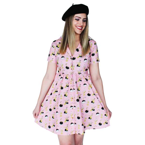 “A true shoutout to the SECOND-best romance from Beauty and the Beast—Lumiere and Fifi. Featuring a classic ‘bowler’ dress fit and an all-over print, this dress is perfect for any fan of their adorable French love.”