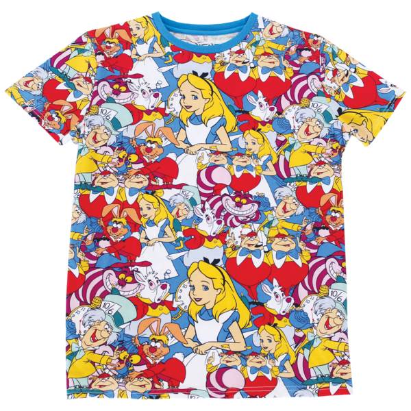 “The artwork on this Alice shirt will instantly bring you back to the first time you saw this 1951 Disney animated film along with all the curiosity and adventure that Alice originally inspired in you.” Characters include Alice, Cheshire Cat, Mad Hatter, Tweedledee and Tweedledum, White Rabbit, and March Hare.
