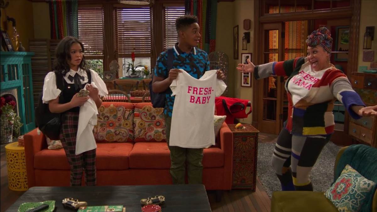 Raven is ironing in the living room and getting emotional as Booker gets ready for his first day of high school. Nia walks out talking to Tess on speaker phone, who is in a serious relationship with Ramon now and has broken their typical first day of school plans to wear matching outfits and go to school together. Raven disappears for a moment and returns with shirts she made for the twins that say “Fresh-Baby,” saying that since she and Tess can’t match, now they all can. Unzipping her hoodie, she has a shirt just like it that says ‘Fresh-Mama.” Nia and Booker look at each other and decide to run. Raven follows them holding up her car keys.“I’m your ride, where you going?”