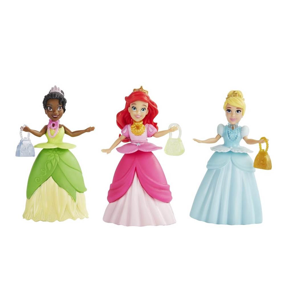 - Each 3.3-inch Disney Princess doll comes in a large skirt that opens up to reveal a compartment inside, complete with mirror. Kids can dress up their doll in different skirts, bodices, and shoes they'll find inside. They'll also find purses and necklaces to complete her look.