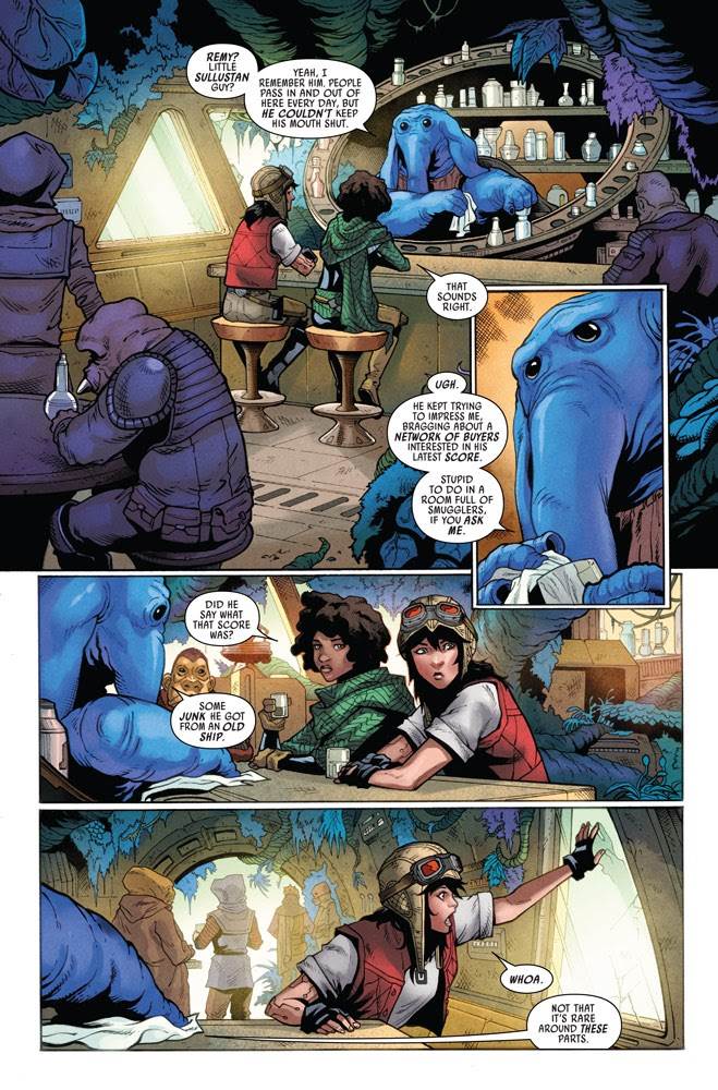 The two women explore one of the Nihil ships and find that Remy may be mistaken (or perhaps intentionally misleading) about what he found inside. But Aphra’s technical know-how means she has a better grasp on how to unlock the centuries-old tech, which may prove invaluable to the Rebel Alliance or the Galactic Empire-- depending on which side of the galaxy-wide civil war roves to be the higher bidder for this largely amoral protagonist. Naturally their plan is interrupted by the arrival of General Vukorah of the Unbroken Clan (itself a tie-in with Marvel’s current Star Wars: Bounty Hunters comic), who wants the Nihil’s experimental hyperdrive technology for herself. Can Chelli and Starros escape Vulkorah’s wrath and keep the priceless machinery intact long enough for them to make use of it?