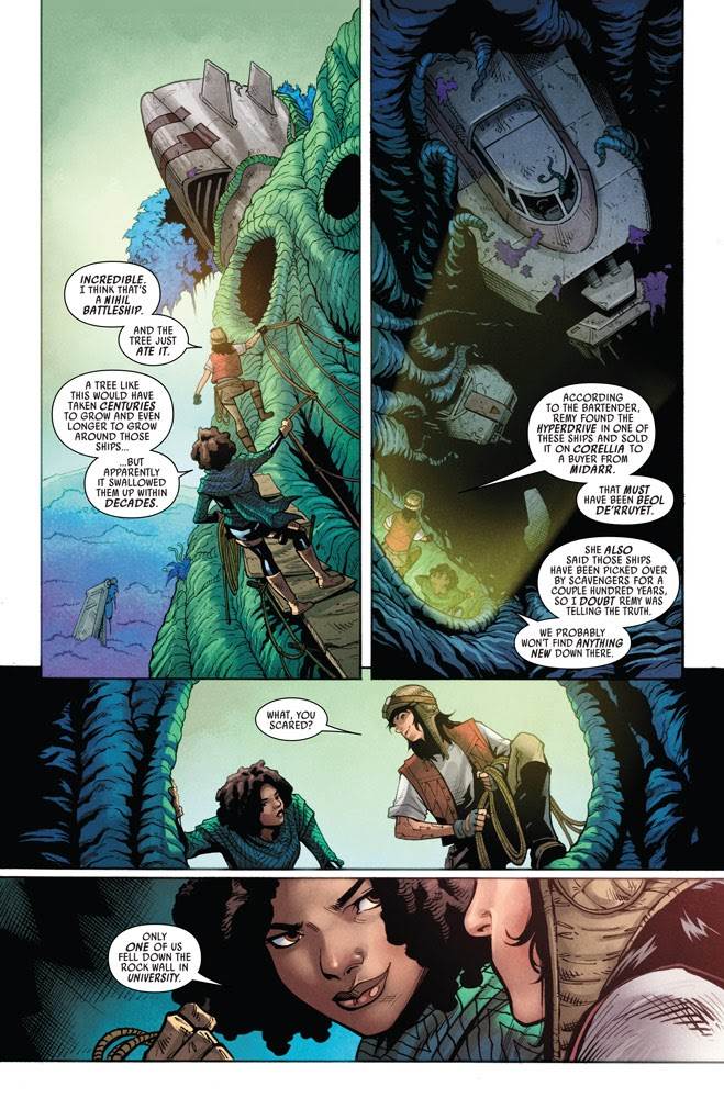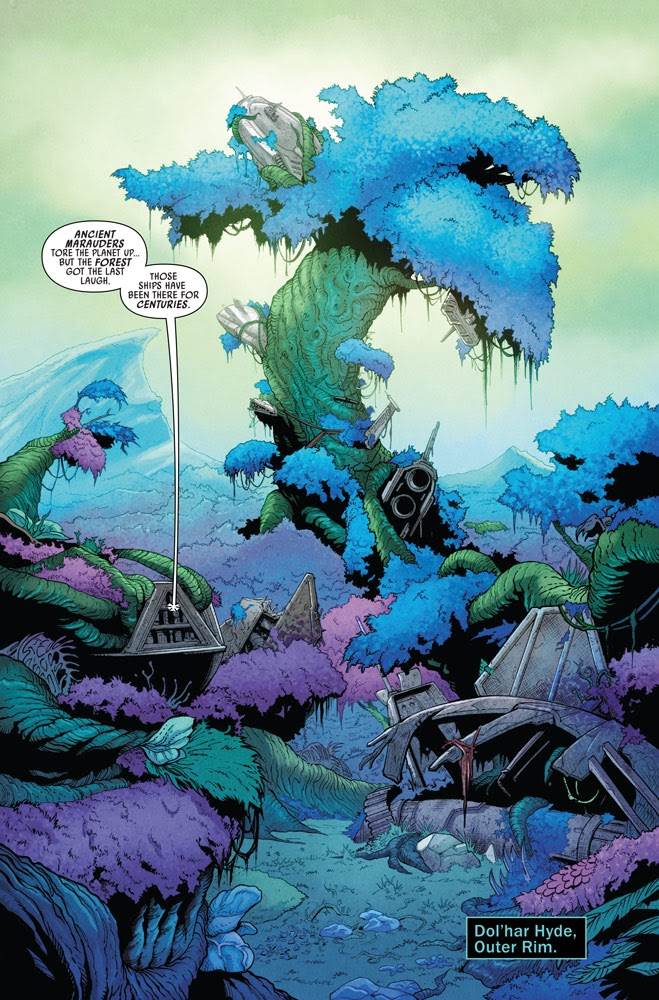 “The Engine Job - Part 3: Old Wounds” picks up with Aphra and Sana on the Outer Rim planet of Dol’har Hyde (get it?), where an Ortolan bartender informs them of the Sullustan Remy’s (see previous issues) attempts to retrieve ancient technology from the ships mysteriously embedded in the trunks of trees on the planet’s surface. That image alone is worth picking up this issue, but there’s also a cool Indiana Jones-esque adventure to go along with it, as is Doctor Aphra’s usual reason for being.