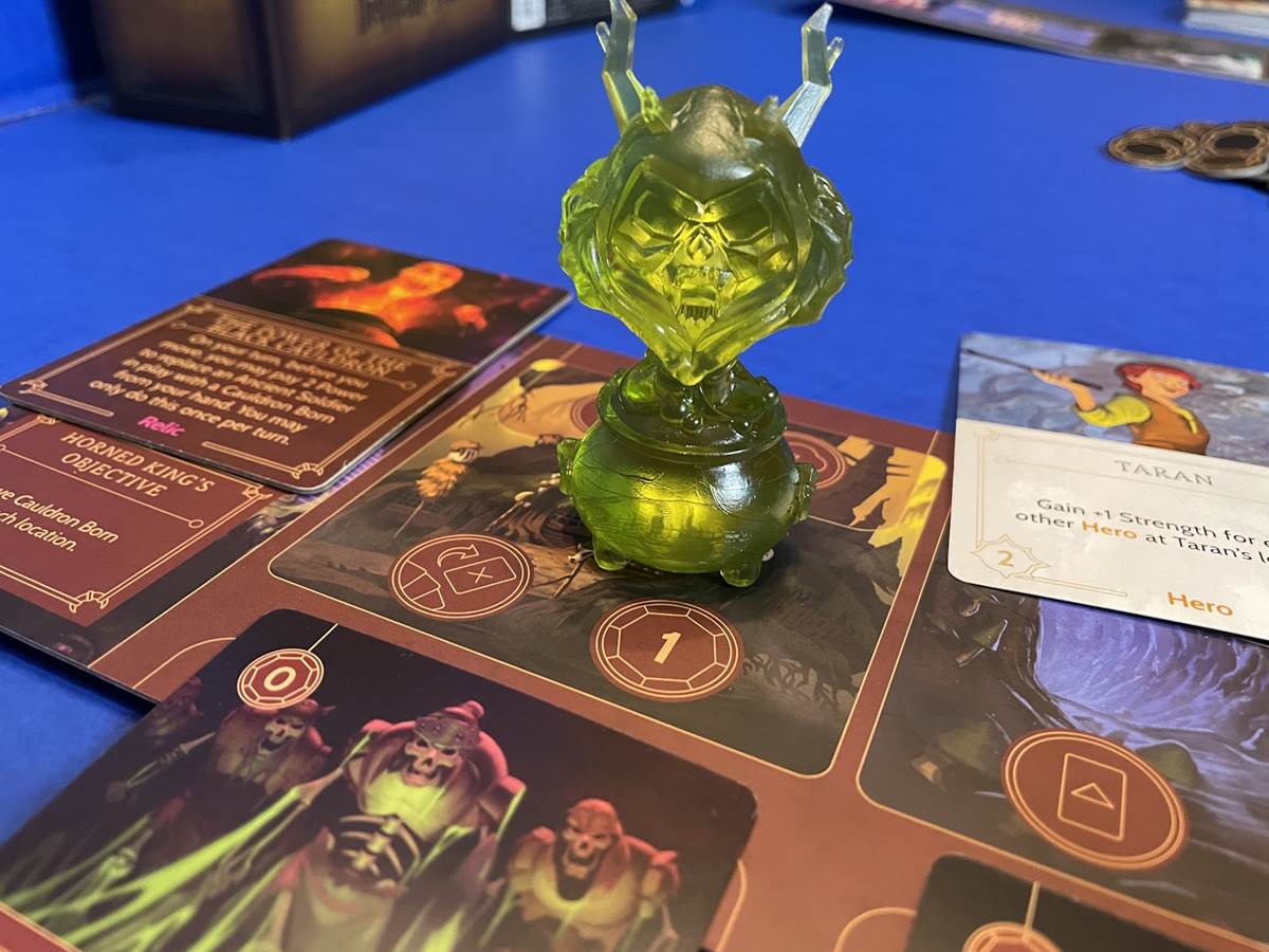 The Horned King needs to find The Black Cauldron, a bonus “Relic” card with two sides, one of which activates it to allow him to create Cauldron Born. To win the game, The Horned King needs to have a Cauldron Born in each realm of Prydain.
