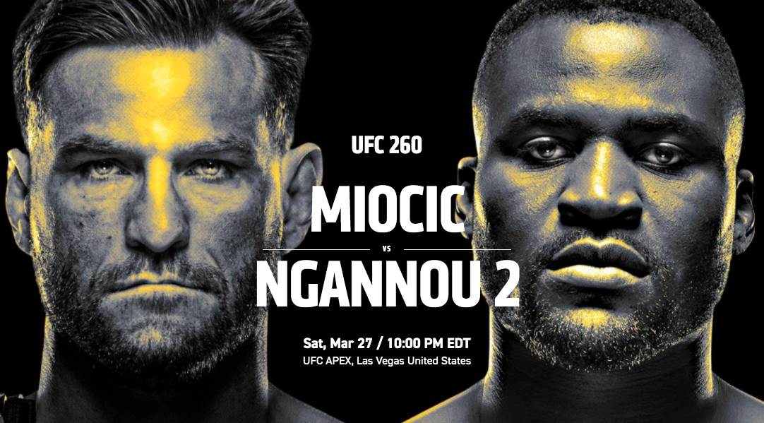 UFC 260 will be held Saturday night, March 27 at 10 PM ET. Fight fans can order the pay per view through ESPN+ and receive a special offer: $89.98 for UFC 260 and an ESPN+ annual plan. ESPN+ subscribers can order the pay per view for $69.99.