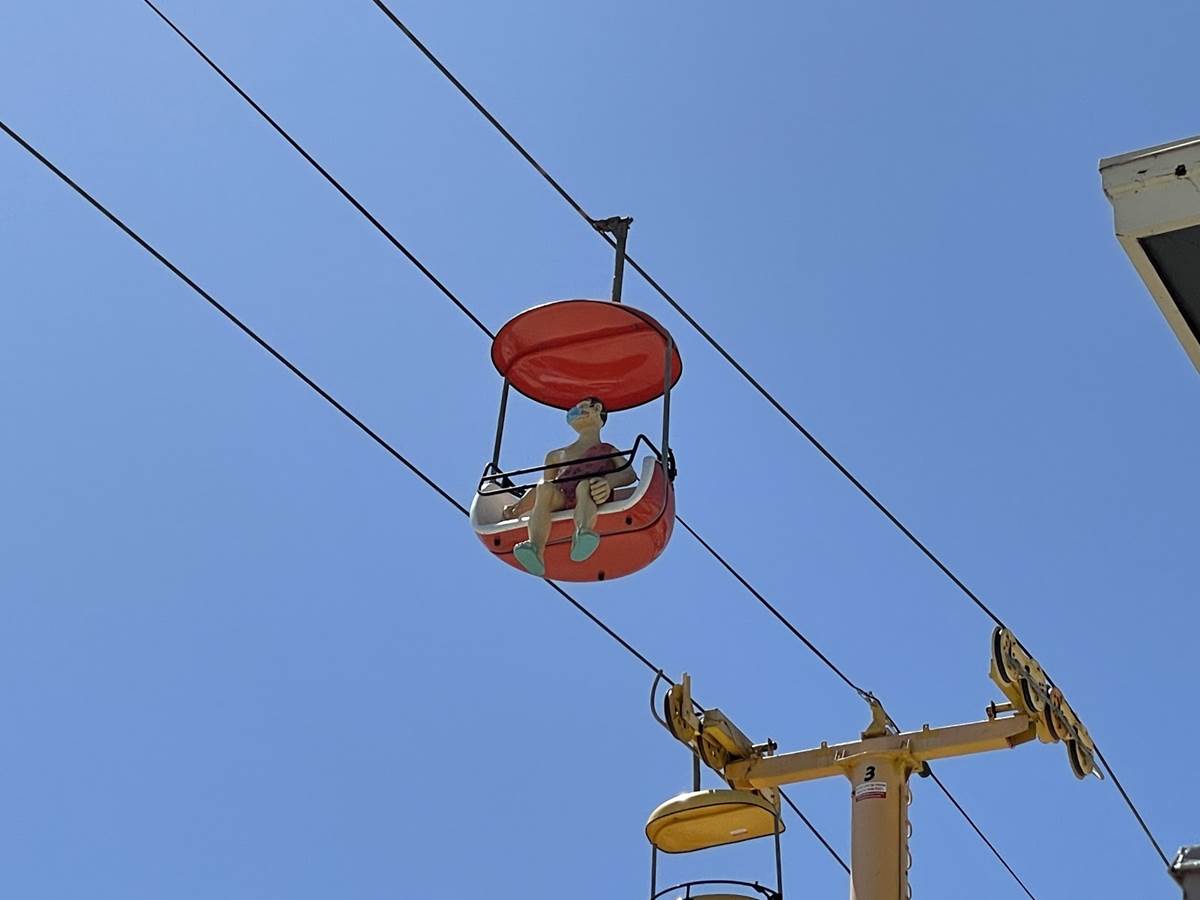 One of my favorite experiences from the day was riding the Sky Glider, which connects most of the boardwalk’s outdoor space. A few of the chairs have cave people riding in them, one of whom is reminding visitors to wear a mask.
