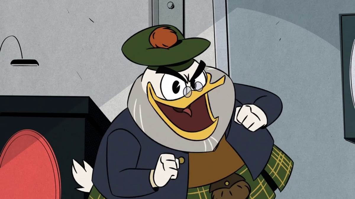 Huey skips to Chapter 13-- “Bark Beetles: A Day in the Life” and is of course quickly cut short by yet another ad, this time from accident-prone pilot Launchpad McQuack (Beck Bennett), who has started a flying school with just one ten-minute class. “We’ll cover important topics like taking off, landing, avoiding Sky Pirates, remembering to put gas in your plane, what to do when you’re mid-flight and you realize you forgot to put gas in your plane, crashing, and asking Mr. McD to pay for the repairs.” Huey gets angry at Louie for playing another ad without his permission or even his knowledge. And before he can even begin to read Chapter 14, Louie breaks in with another two ads. The first is for the Beagle Boys Security Testers-- swiftly breaking the promise Louie made about not having any ads from actual criminals-- and the second is from another villain, namely Flintheart Glomgold (Keith Ferguson).