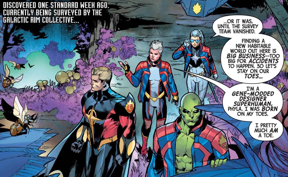 A lot of recent comics have featured some very unique and fun groups of characters but perhaps none quite as much as this one. In this comic, you’ll find, Hulkling, Wiccan, Nova, Star-Lord, Gamora, Drax, Rocket, Groot, Moondragon, Phyla Vell, Quasar, Marvel Boy, Super Skrull and even [redacted]!
