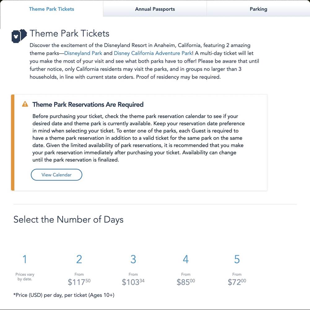 Taken to a screen where you’re presented with ticket options, I recommend clicking “View Calendar,” which opens a new window that shows you which parks are available which days. It uses icons to represent Disneyland and Disney California Adventure. If only one park is available and you’re using a park hopper, you can move to the other park after 1:00 pm.