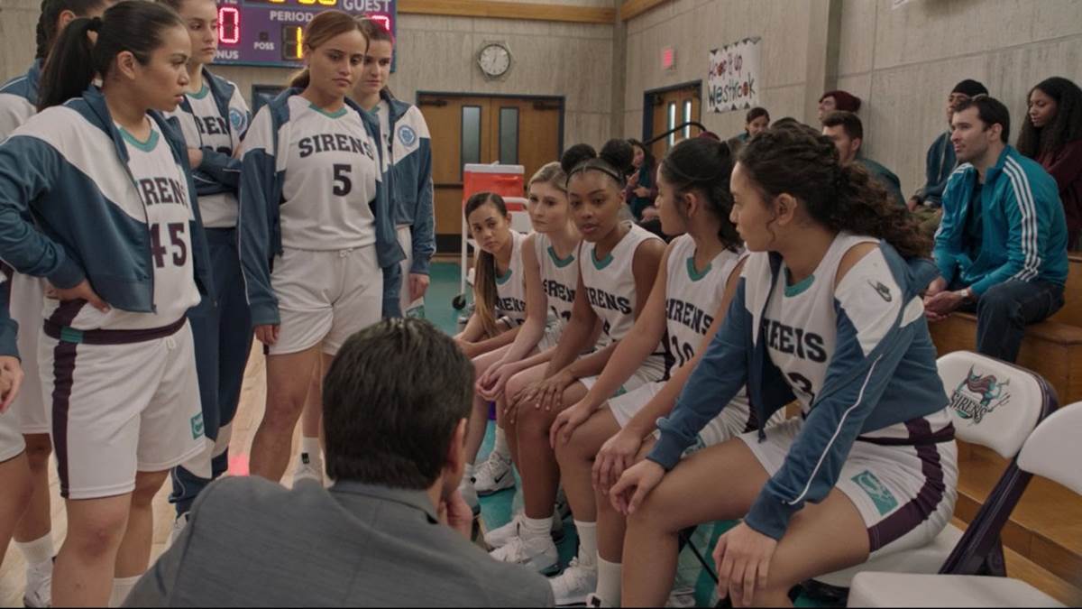 Out on the court, Marvyn blows his whistle to get their attention. A girl named Olive (Monique Green) dribbles past him, telling him whistles are “Triggering.” While introducing himself, Coach Korn promises he will be direct, adding that if he calls them stupid, they should ignore it, but if he says why they’re stupid, they should pay attention. He reveals that the Sirens are 1 in 3 for the season and that their next game is Friday, playing against Laguna Niguel, adding that he intends to beat them. He instantly gives the girls advice to lose a pound, pointing to Destiny (Tiana Le) and telling her she needs to lose 5 pounds. This prompts Samantha (Cricket Wampler) to make a squeaky noise that sounds almost like a laugh, who defends herself against the tough coach, telling him she can’t help it, it’s related to a brain injury when she was a child.
