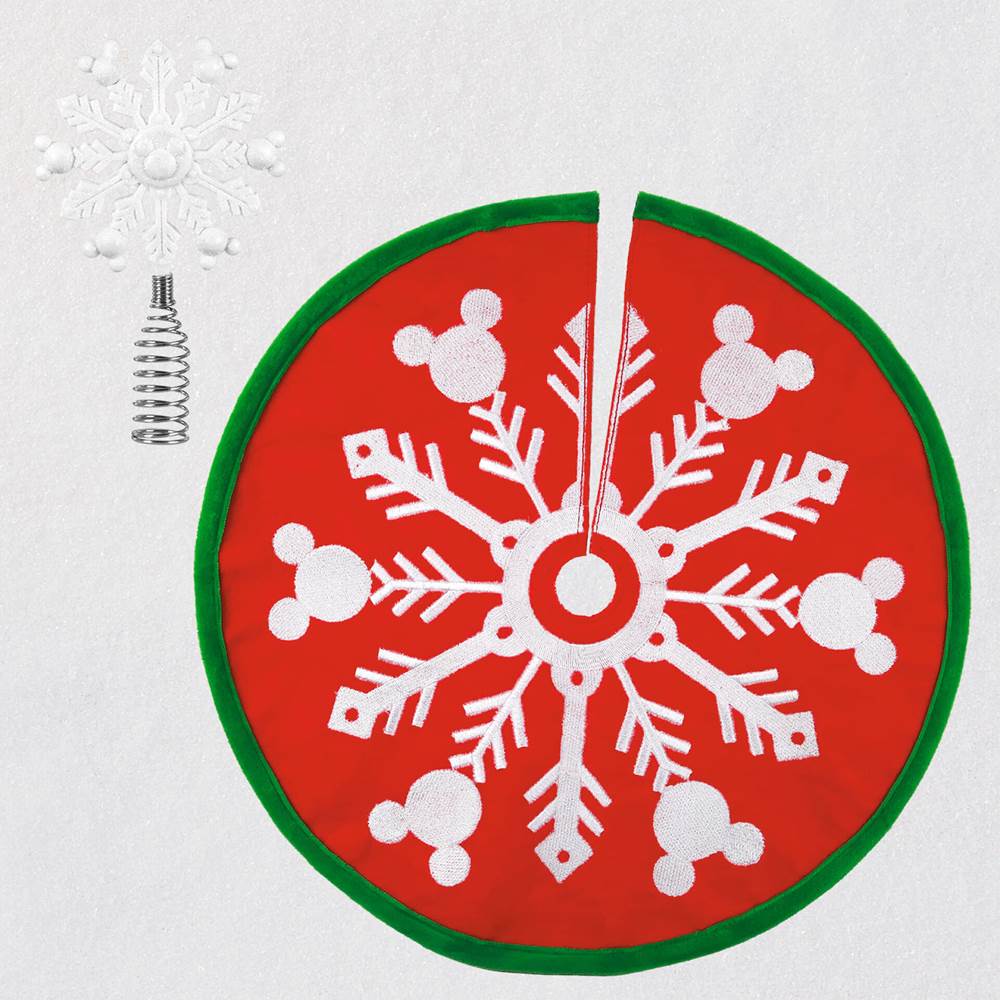 In the past, Hallmark has also been presenting a line of ornaments for smaller tabletop trees and this year is no exception. They have a Santa Mickey and Minnie to grace your small tree as well as a miniature tree topper and miniature tree skirt. The red fabric base features a velvet green trim with mouse ears snowflake design. The skirt is coordinated with a mouse ears snowflake mini tree topper with a dusting of glitter and a metal spring base.