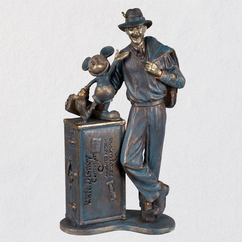I am particularly interested in the Walt Disney Mickey Mouse Storyteller Statue ornament highlighting Mickey and Walt in a replica of the iconic statue that greets guests on Buena Vista Street at Disney California Adventure at the Disneyland Resort in Anaheim. The ornament pays homage to a young Walt and Mickey fresh off the train from Missouri to start living their dreams. This item is a follow-up to a similar ornament Hallmark offered a few years ago featuring the Blaine Gibson designed statue of Walt and Mickey hand-in-hand at the castle hub at Disneyland and Walt Disney World.