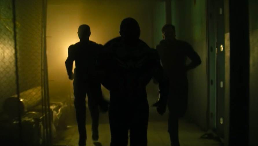 In the basement, two groups of GRC reps are loaded into their vehicles as Sharon watches on. A security guard, now revealed to be a Flag Smasher, closes the door and places a device on it that locks it from the outside, trapping the reps in the vehicle.