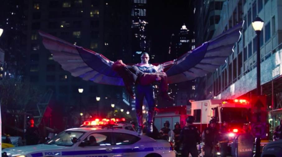 As Sam pursues the helicopter, an NYPD chopper approaches to try and help but the pilots quickly find themselves in trouble. Sam saves the pilots by pulling them from the chopper and flying them to safety on a nearby bridge. As Sam protects the officer, he draws cheers and applause from onlookers on the bridge, the first signs of support for our new Captain America.