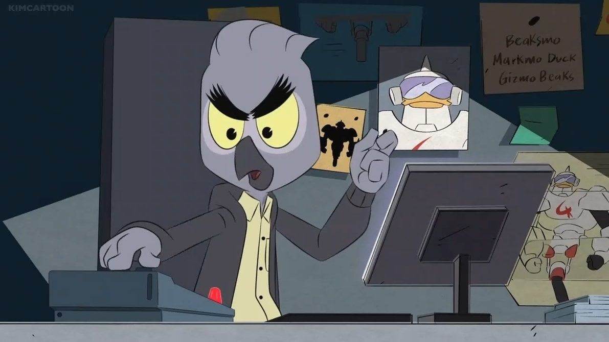 Huey continues the story by saying that one day soon after he received a collect call from Glomgold, who was in prison at the time. Flintheart begs Huey for help in proving his innocence, claiming he’s been framed. Huey reluctantly agrees, with part of him believing Glomgold may in fact be innocent. Huey and Glomgold continue their conversations over the phone, with the latter repeatedly insisting he’s not guilty: “I know I try to ruin Scrooge’s life any chance I get, but I promise you I didn’t do it this time!” Flinty tells Huey to look into the social media check-in, which he says he never made. As part of his investigation, Huey interviews tech guru Mark Beaks (Josh Brener), inventor of the WaddlePhone, which Glomgold used that day. Beaks, calling in from his yacht in Birdmuda, says it’s not possible to falsify a check-in: “WaddlePhones are supes secure… and they barely leak battery acid anymore.”
