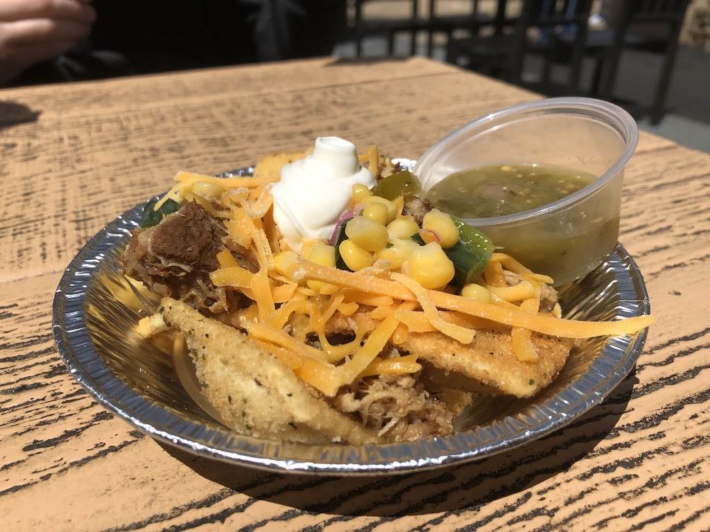 Of the “savory” items we sampled, this was our unanimous (between the two of us) victor. It starts with a bed of half a dozen or so toasted raviolis, filled with a queso-esque cheese filling that contains an ever-so-slight amount of spice. On top of that is pulled carnitas, shredded cheese, corn salsa, and a dollop of sour cream. A cup of salsa verde is also served on the side. When you put it all together, this was a very intriguing and surprising dish that we couldn’t get enough of. In fact, of everything we tried, this is the one we’d be most inclined to buy again in larger quantity if offered. Warm and delicious t-ravs, juicy and tender pork, and addition of salsa — all made this one was a big winner.