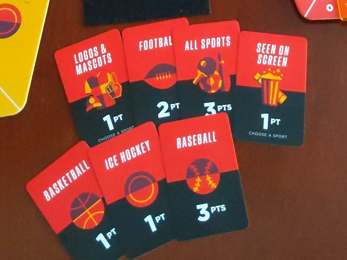 Question cards are sorted into 7 categories - the scoring categories of All Sports, Baseball, Basketball, Football & Ice Hockey are presented with a 1pt, 2pt, or 3pt question. The categories of Logos & Mascots and Seen on Screen offers questions from the various sports and can only garner a single point. The team that will be answering must select which sport.