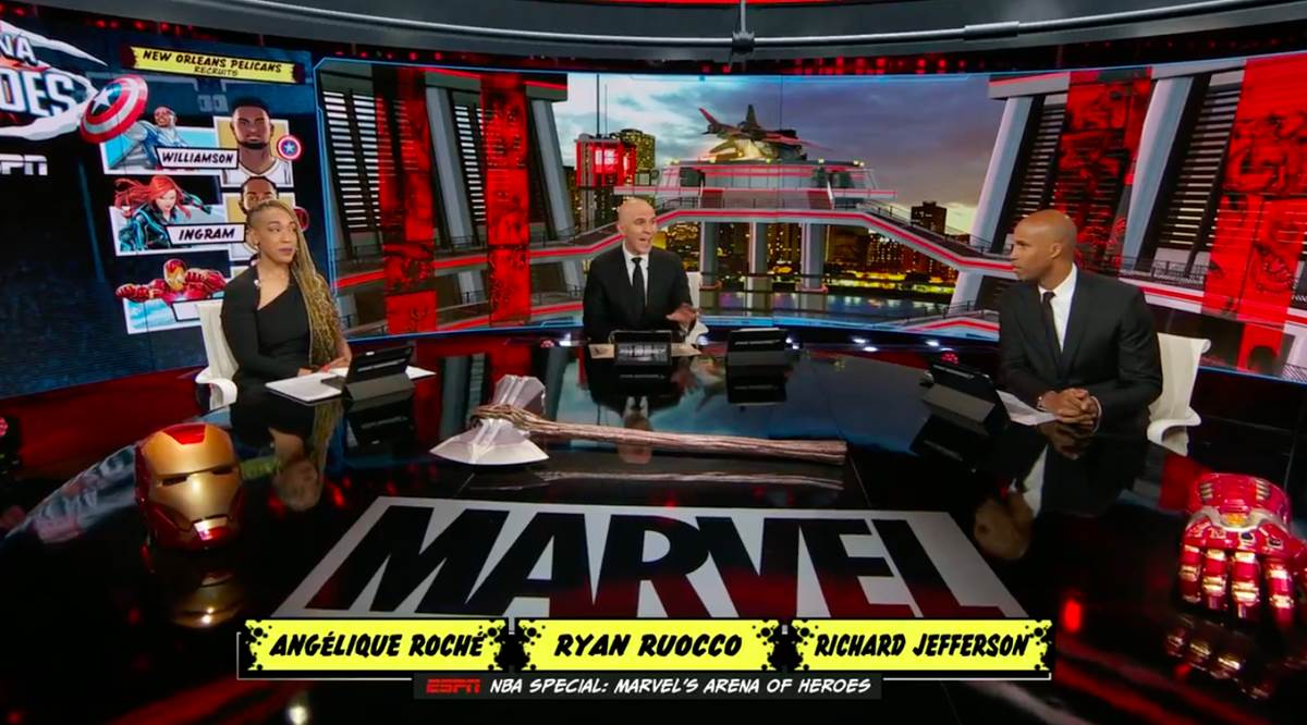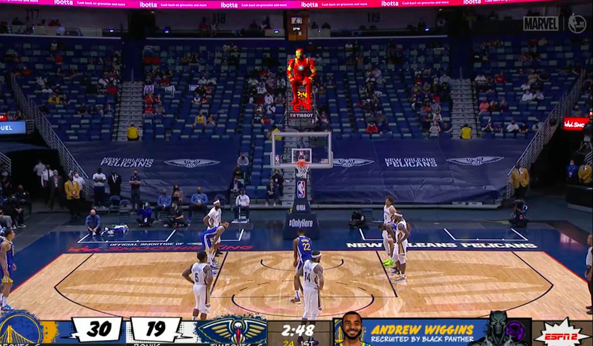 ESPN2 and ESPN+ aired a special presentation of the NBA matchup between the New Orleans Pelicans and the Golden State Warriors tonight that turned the game into a contest of Earth’s Mightiest Heroes. “Marvel’s Arena of Heroes” put an Avengers twist on the game.