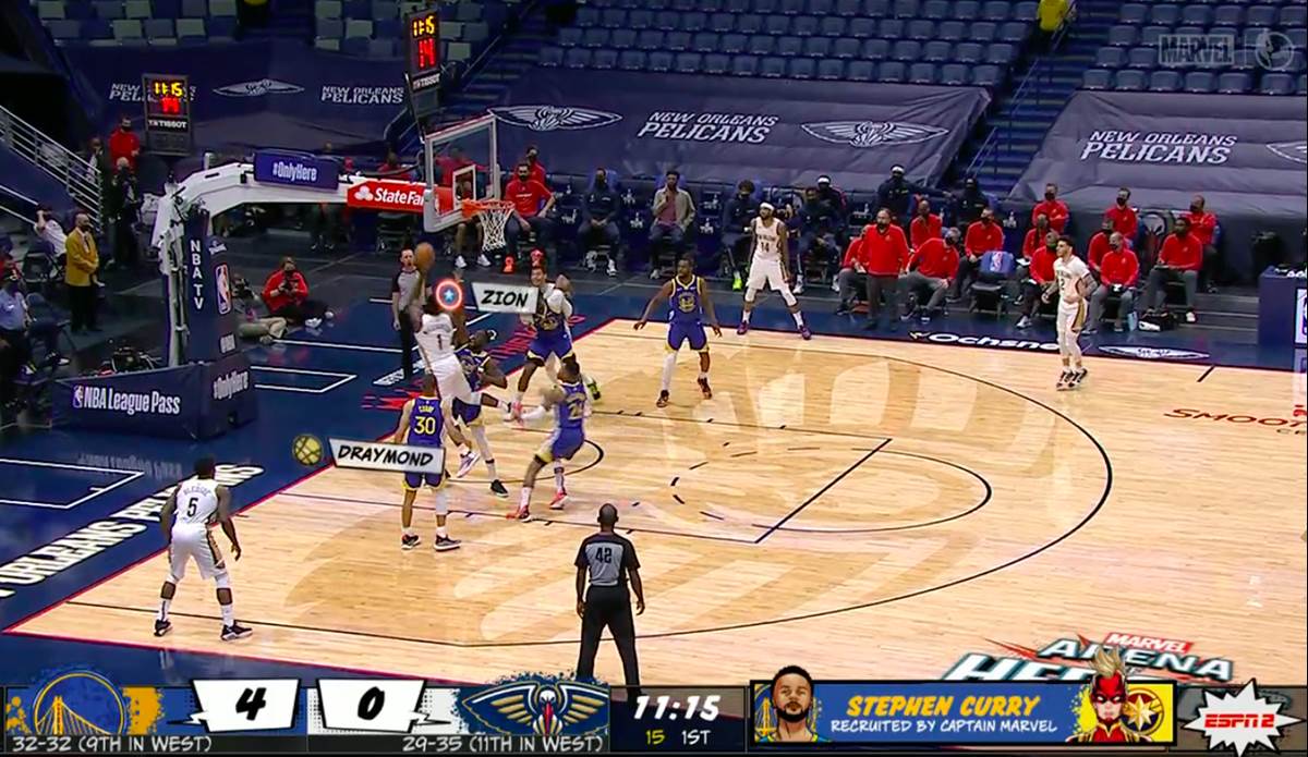 Six Avengers selected six players to represent in the game. On the Pelicans side, Captain America chose Zion Williamson, Black Widow went with Brandon Ingram and Iron Man selected Lonzo Ball. On the Warriors side, Captain Marvel opted for Steph Curry, Doctor Strange chose Draymond Green and Black Panther went with Andrew Wiggins.