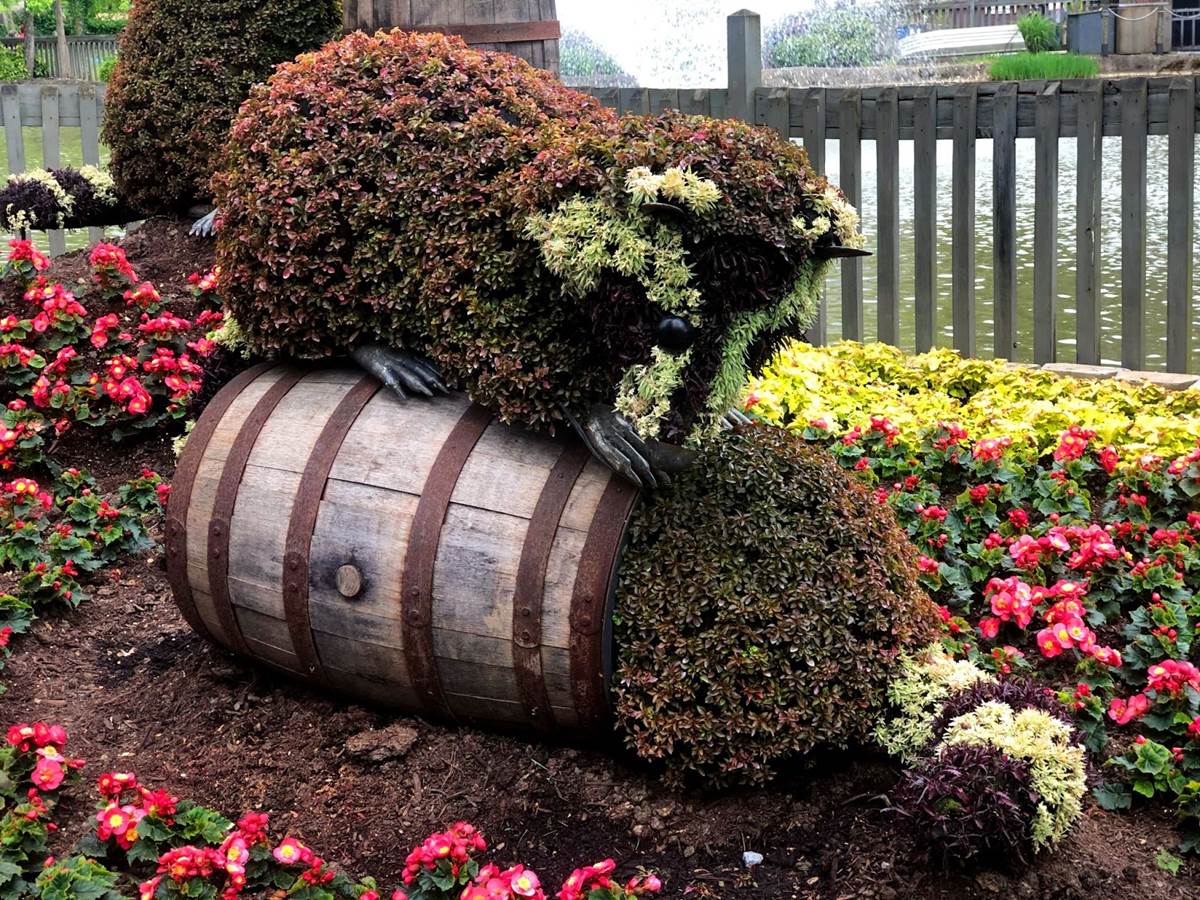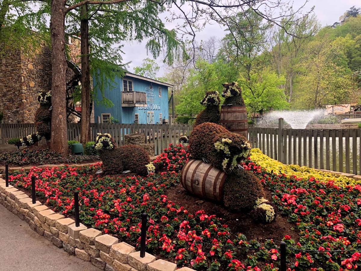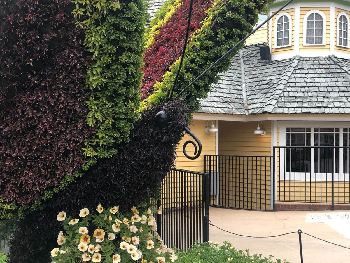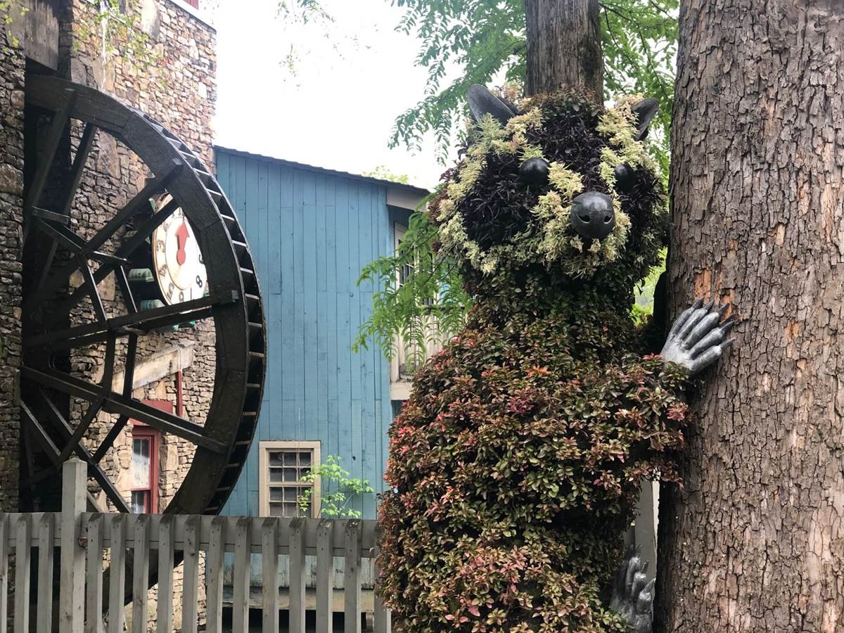 In Rivertown Junction, you’ll find many mosaiculture displays featuring some of the famous residents of the Smoky Mountains. From playful racoons, curious turtles, a family of bears, and a frog, it’s impressive to see the creative choices of vegetation used to bring these sculptures to life.