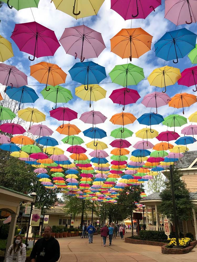 The first festive display is the colorful “Umbrella Sky” , a collection of hundreds of beautiful parasols that create a giant canopy over Showstreet. The umbrellas not only are captivating, but also help provide cover for the occasional spring shower or the hot rays of the sun. Midway, you’ll find a photo opportunity with parasols to borrow to take a unique picture with a Dollywood photographer.