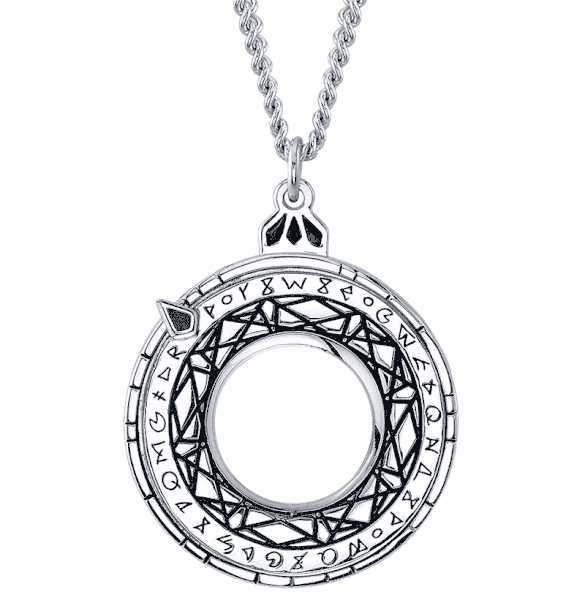 “Inspired by the astrolabe, an ancient astronomical instrument used to measure celestial bodies of the universe, this mystical medallion is brightly polished and blackened for contrast. Rotate the dial to spin the etched sigils, replicating Doctor Strange’s dynamic hand motions to move forward and backward in time. Substantial in weight, it hangs from a heavy adjustable 24-inch sterling silver curb chain.”