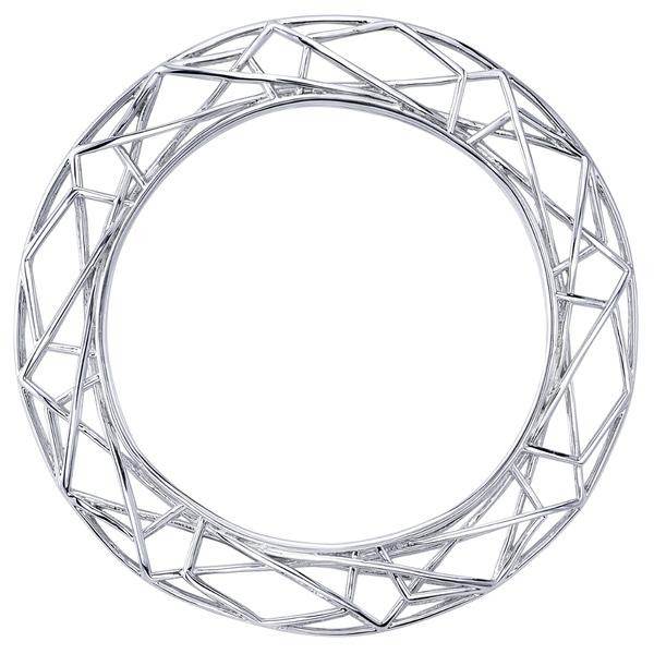 “Sculpted in durable artisan brass and thickly plated in polished silver, this bangle is a three-dimensional geometric manifestation of the Time Spell used against the dark powers who would seek to harm our world. Available in two sizes. Eye-catching and substantial in size, it is lightweight and comfortable to wear.”