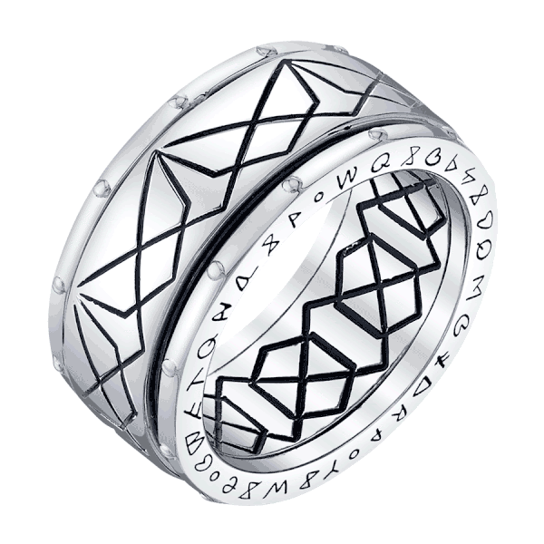 “Carved in solid sterling silver, this spinner ring is etched with the fractal geometry and sigils of the Time Spell. Brightly polished and blackened for contrast, every surface is engraved with potent patterns, including the interior ring band. Thick and durable with a beaded textured border, this ring is perfect for the fidgeting Magician.”