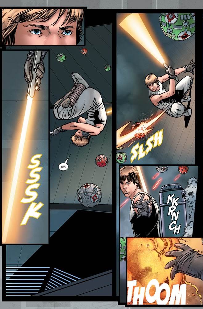 What follows is a perilous shootout at the arena’s box-office window, followed by a daring escape after the Kanji manage to figure out they’re dealing with a lightsaber-wielding Jedi Knight. It’s unfortunate that this adventure turns out to be something of a dead end for our heroes, as they flee on the Falcon having not accomplished much except recruiting Sagwa to the Rebel Alliance. But despite not having tracked down Boba Fett, in the end Luke manages to make time to listen to R2-D2 and gets a valuable piece of information that deepens our understanding of his whereabouts in the Star Wars sequel trilogy. There’s also a cliffhanger ending that is sure to pay off in future issues of this comic, if not in other War of the Bounty Hunters tie-in titles coming down Marvel’s Star Wars pipeline. I have to say I’m relieved to see the individual installments of this massive crossover event interweaving with each other so soon, as I was worried these “Prelude” issues might continue to feel more like piece-moving setup than actual storytelling. But writer Charles Soule remains at the top of his game and-- in collaboration with equally talented artist Ramon Rosanas-- his “The Hunt for Han Solo” does an admirable job in building interest in the event.