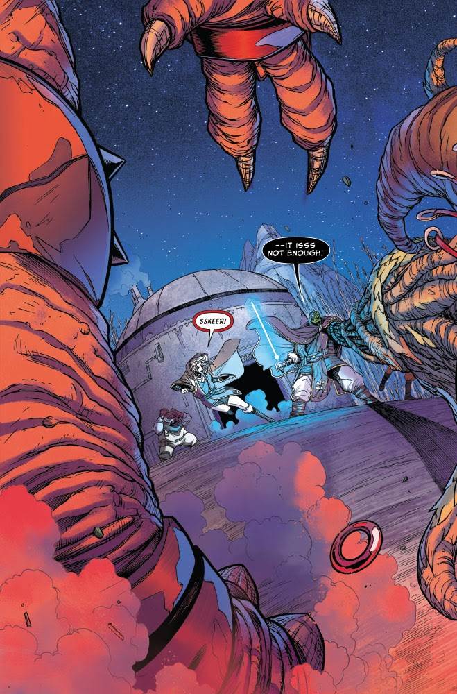Unnecessary flash-forward aside, the main story of The High Republic #5 opens with Myarga the Hutt having landed on Sedri Minor, where the Jedi Knights serving at the nearby Starlight Beacon space station have uncovered an infestation of the sentient dark-side plant monsters called the Drengir underneath the planet’s surface. Myarga has brought along with her an army of mercenaries and a couple giant, menacing Gamorrean-guard-mounted Rancors, all of which threaten to extinguish the Jedi present unless they take leave of Sedri Minor on the Hutt’s orders. This is all part of the Hutt Cartel’s protection racket, but little does Myarga know how much she and the planet’s residents need the Jedi’s help in fighting off the Drengir. Meanwhile, Sskeer reveals himself to be not quite as free of the Drengir’s telepathic grasp as we readers might have thought based off the end of the last issue.