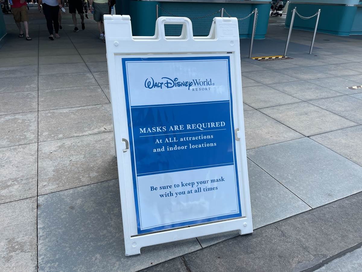 Face coverings are required on Disney transportation, including the Disney Skyliner, but you can take them off once you’re back outside. New A-frame signs have been added reminding Guests to keep their face mask with them as they will need to wear them anytime they go indoors or enter the queue for an attraction.