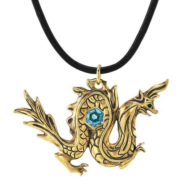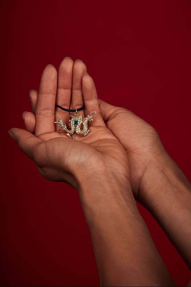 “Carved in solid sterling silver, the Dragon Charm Necklace reflects the power of Kumandra. Three dimensional and double sided, the sculpted dragon is plated in yellow gold and antiqued by hand – no two pendants are exactly alike. Set within the piece is a faceted turquoise hexagon crystal.”