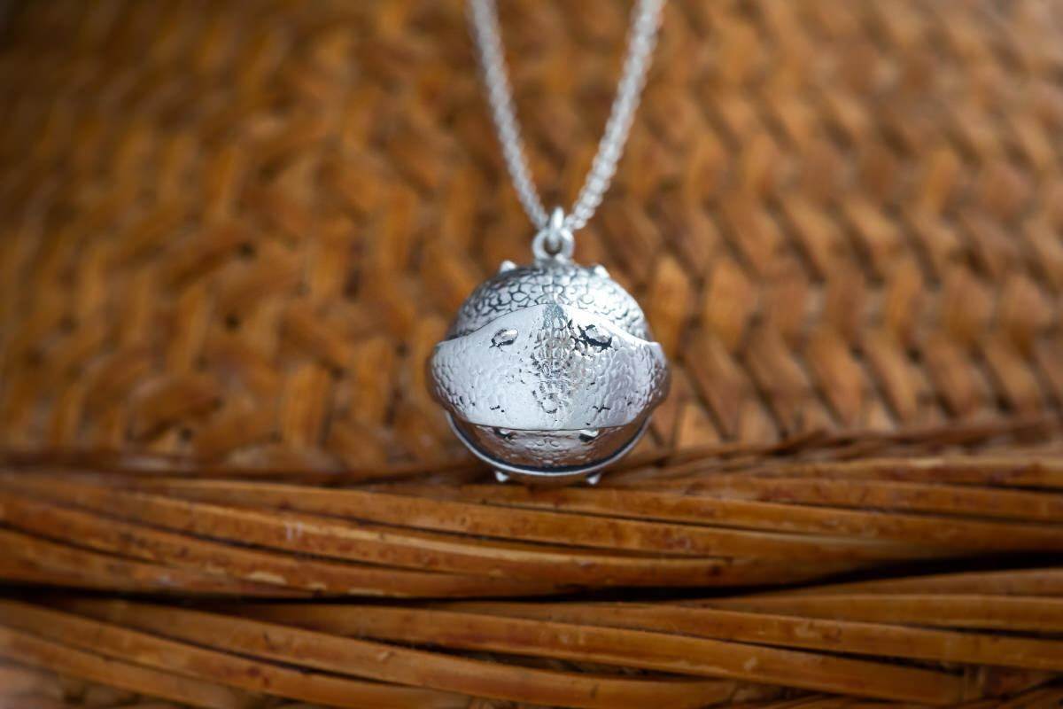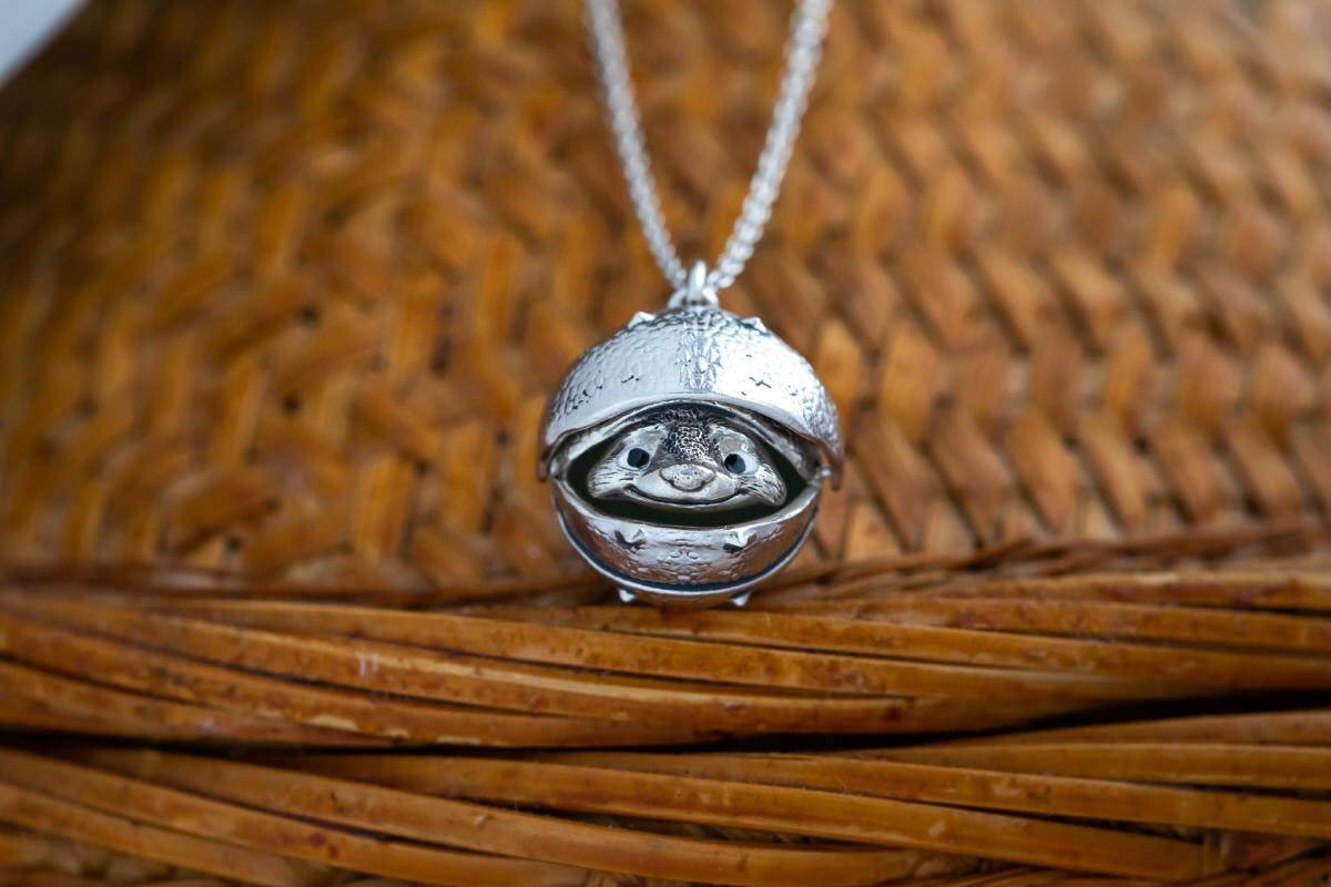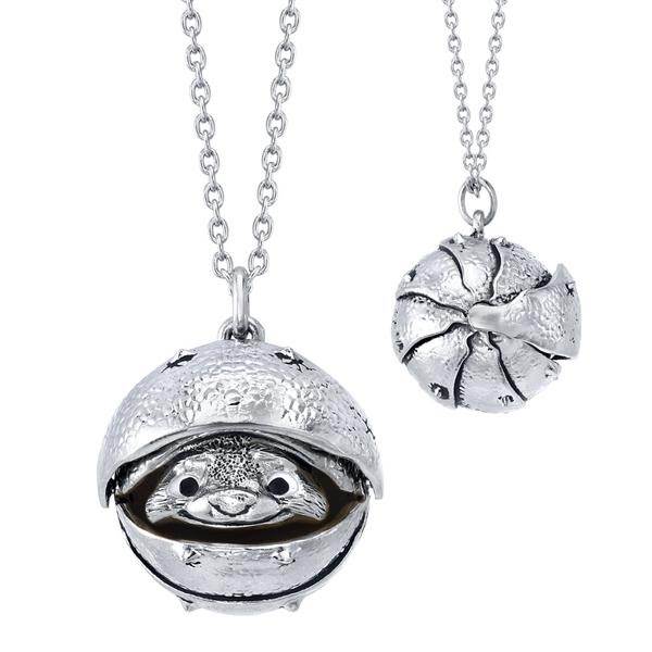 “Antiqued for contrast, an articulated armor plate lifts up to reveal Tuk-Tuk’s smiling face beneath! Intricately detailed and incredibly charming, the pendant hangs from an adjustable sterling silver cable chain.”