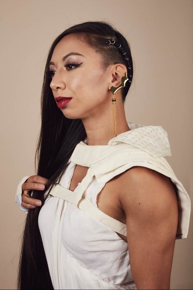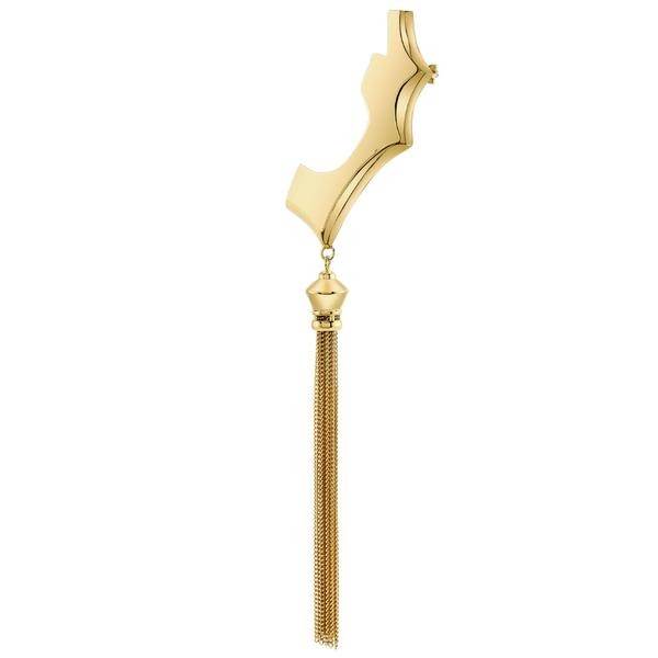 “Show-stopping and inspired by the detail and proportions seen on-screen, the ear climber gracefully frames the left ear. The design curves gently around the edge of the ear lobe like armor and includes two points at the top of the climber. A matching gold-plated brass tassel made of fifteen individual slender curb chains drapes elegantly down to the shoulder.”