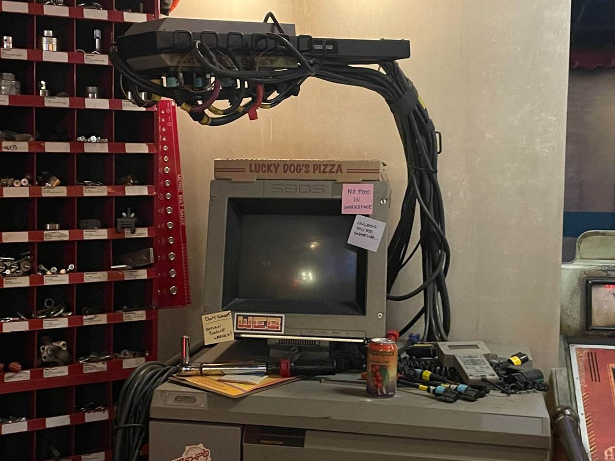 In the queue for the new WEB SLINGERS: A Spider-Man Adventure, guests can scan a messy workspace for a marvelous canine friend. A box that sits atop a computer monitor reads “Lucky Dog’s Pizza.” This is a reference to Hawkeye’s dog Lucky from the comics, who we meet as he is holding a slice of pizza in his mouth. If there is one future meet and greet we’re hoping to get in Avengers Campus, it’s Lucky.
