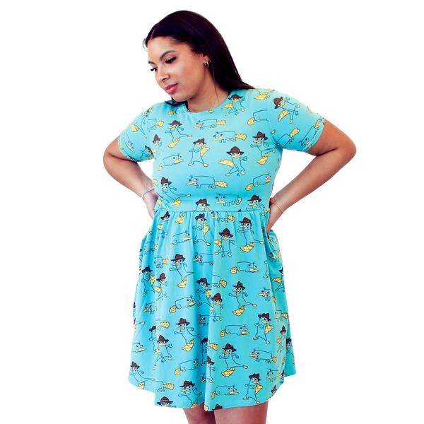 “Inspired by everyone’s favourite animal agent, this Perry the Platypus dress is just what every Phineas and Ferb fan needs. With it’s super comfortable and stretchy 95% Cotton/ 5% Elastane fabric, this dress is perfect for your next adventure—just don’t let Candace find out!”