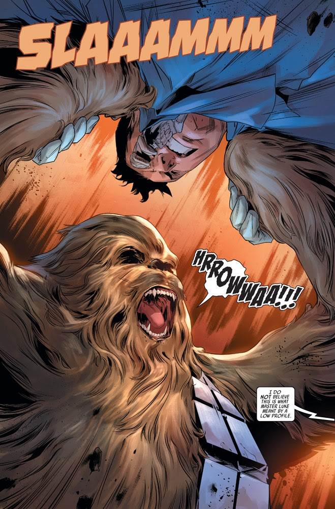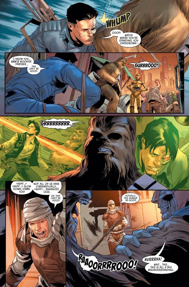Tying in with this summer’s highly ambitious Star Wars: War of the Bounty Hunters crossover event, Bounty Hunters #13 opens with Valance rushing through the marketplace of Nar Shaddaa, Dengar in tow. Dengar brings them to an old contact of his who opts to have his goons open fire rather than give any actual information to the hunters, and in the ensuing chase they run across Han’s Wookiee pal Chewbacca and protocol droid C-3PO (both on the smugglers’ moon due to events depicted in the recently released Star Wars #13 by Charles Soule). Naturally there’s some pre-existing tension between these notorious bounty hunters and the rebel heroes, and Chewie isn’t about to let Dengar and Valance breeze by without a fight. Can Valance convince the loyal Wookiee that he’s trying to help Han before he gets his cyborg arms ripped out of their sockets? It’s a pretty exciting brawl in the streets on the path to finding out.