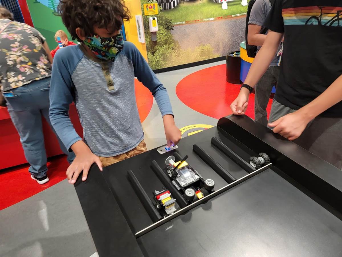 Most people would spend about three hours here without repeating an activity but you can easily stretch out the day. For example, the theater offers three different films that rotate through the day. Our favorite was Lego, and the other titles focused on Lego City and Ninjago. Speaking of Ninjago, that area features a couple of timed activities - a laser maze and reflex challenge - that you might want to try a few times in an effort to improve your score. And my son could easily spend an hour simply building a LEGO racers to go up against other builders on the six lane track. On this visit he had a great time collaborating with fellow racers and builders as they all sought ways to improve their creation's speed.