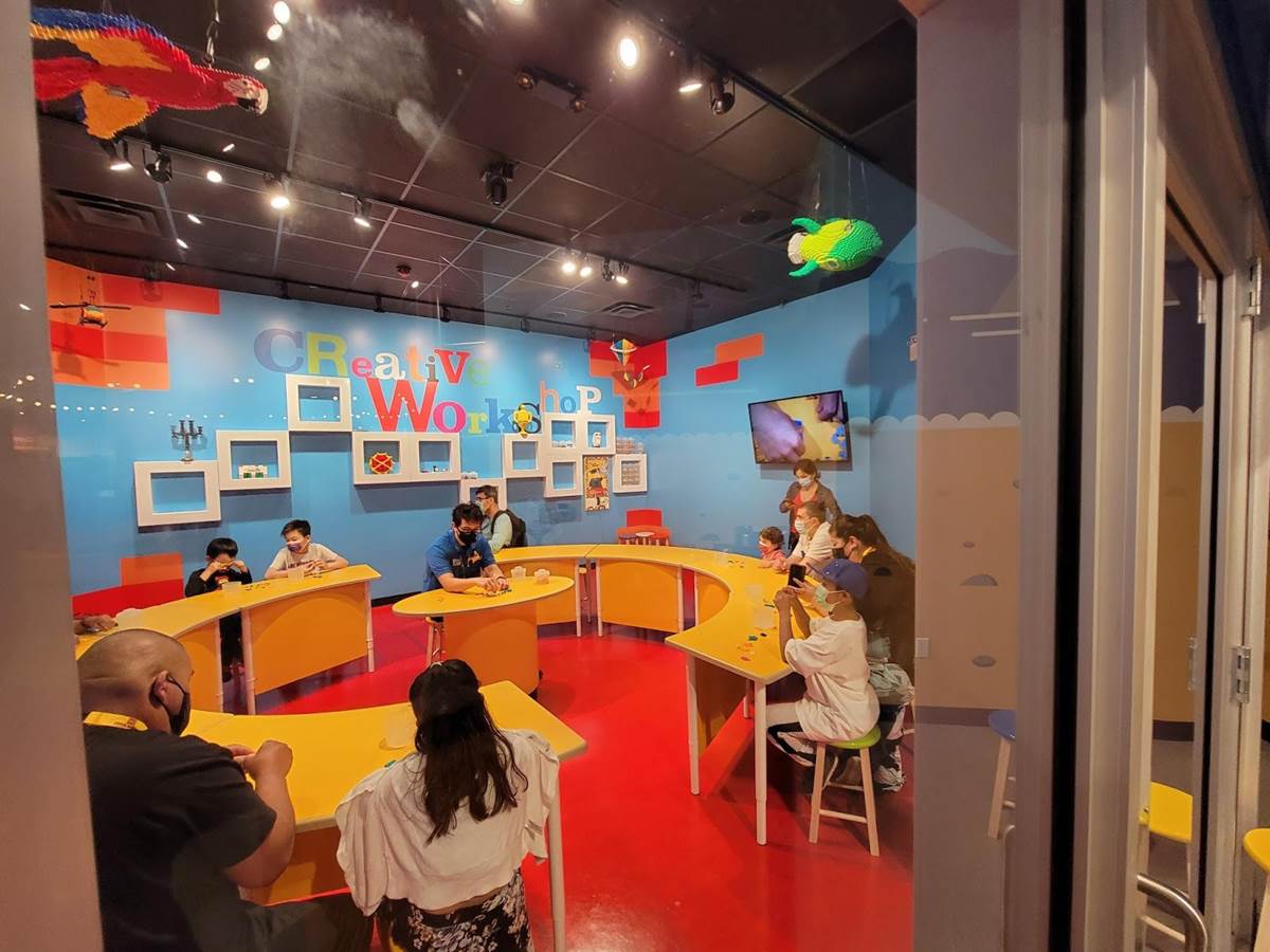 Numerous classes scheduled. 8 the day we were there. Impressive LEGO models suspended from the ceiling inspire creation.