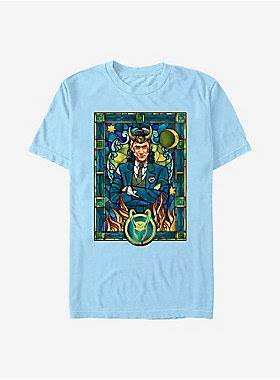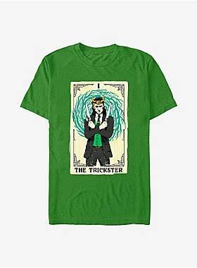 These shirts feature the god of Mischief depicted in stained glass and on a tarot card, two very interesting ways of highlighting his importance and possibly singular motives.