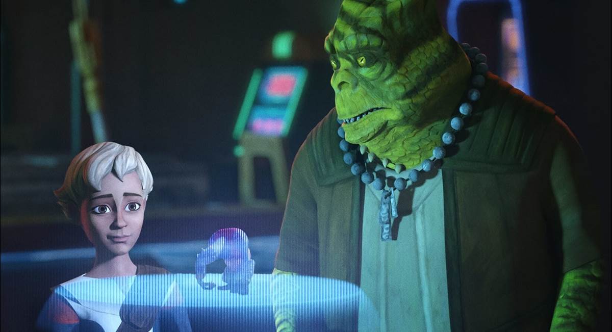 After Cid takes the senator into the back to talk payment, Hunter and Omega have a heart-to-heart. “I wanted to be useful, even if I couldn’t go on the mission,” says Omega. Hunter says they’ll put her strategy skills to the test and challenges her to a match of dejarik. If Omega wins, she doesn’t have to sit out on any more missions. “You ready for this?” asks Hunter. “Are you?” replies Omega.