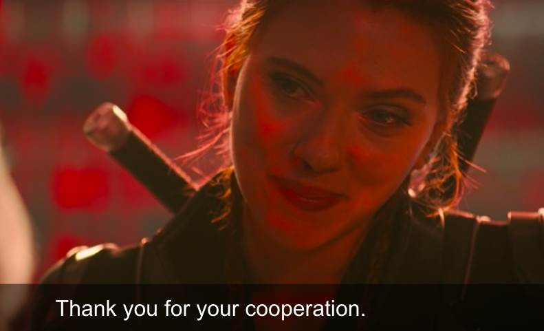 And to take things a step further, Natasha actually repeats her own line from this scene. When she finally comes face to face with Dreykov, who also survived the explosion and assassination attempt, she employs her unparalleled spy skills to interrogate him without him even being aware of it. When he finally give her the information she needs, she thanks him for his “cooperation,” a line she also delivered to Loki.