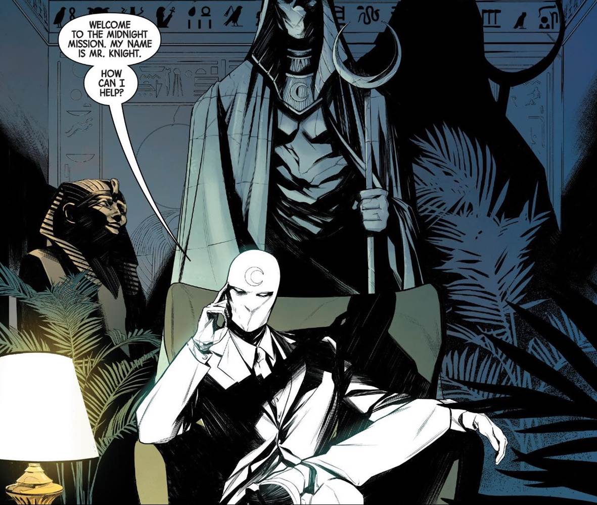 Marc Spector is seeing a therapist, to the surprise of no one, after his god Khonshu tried to take over the planet by empowering him with the most dangerous weapons in the universe. When the Avengers defeated him, they imprisoned Khonshu but they allowed Moon Knight to continue to operate, provided he seek some help.