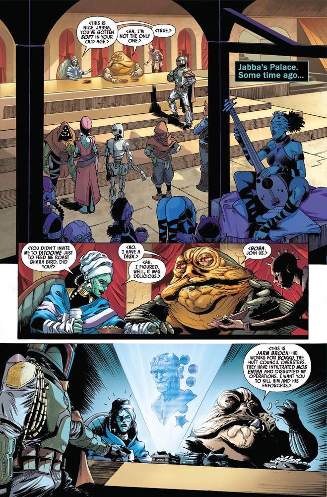 War of the Bounty Hunters - Jabba the Hutt actually takes place a bit earlier in the cronology of this summer’s ambitious Star Wars crossover event, while Boba Fett is working as a gladiator arena combatant on the smugglers’ moon of Nar Shaddaa. Fett is late in delivering the carbonite block containing smuggler and Rebel Alliance officer Han Solo, so Jabba has Bib Fortuna call in the evidently long-lived Deva Lompop-- a member of the Shani species invented by Ireland to appear in both the Original Trilogy and High Republic eras-- to track him down. We also see flashbacks to Deva’s first interaction with Boba Fett, when the two hunters were paired by the Hutt to capture a Zabrak named Jarm Brock whose allegiances are in question. In the “present,” Lompop travels to Nar Shaddaa and seduces the Besalisk technician Doc Ragon, filling in some of the blanks regarding just how exactly the crime syndicate Crimson Dawn came to discover the whereabouts of the carbonite-frozen Han Solo during Boba Fett’s unplanned pit stop.