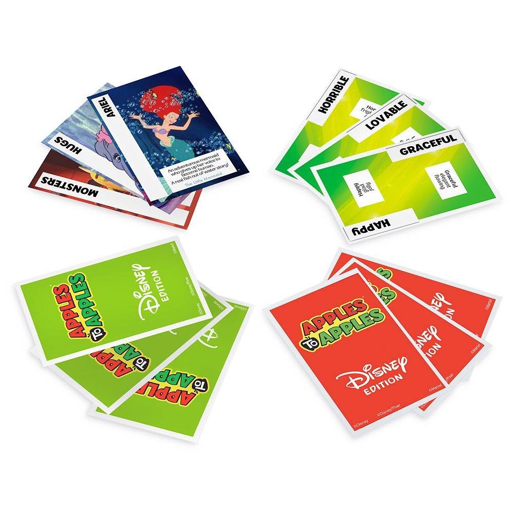 “It's the fast-moving card and party game that provides instant fun for four to eight players! It's as easy as comparing apples to apples. Just deal the cards and you're ready to play. And now, Red Apple cards come to life with pictures from Disney theme parks, movies, and Disney Channel shows. Watch out for the Poison Apple card. It's available only in this Disney Apples to Apples edition, and it will turn the game upside down!”