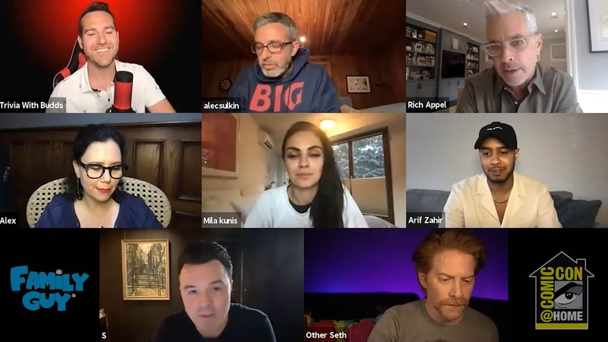 Comic-Con@Home 2021 continued this afternoon with a panel discussion of FOX’s hit animated series Family Guy, which is celebrating its 20th season this year. Participating in the presentation were showrunners Rich Appel and Alec Sulkin, cast members Arif Zahir (new voice of Cleveland Brown), Alex Borstein (Lois Griffin), Mila Kunis (Meg Griffin), Seth Green (Chris Griffin), and Seth MacFarlane (Peter Griffin), along with comedian Ryan Budds.