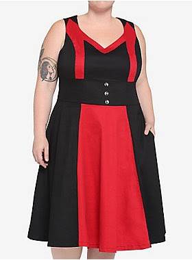 “Harness your inner Chaos Magic in style. This black and red flare dress features the Scarlet Witch's headpiece across the neckline and logo on the waistline's buttons.”