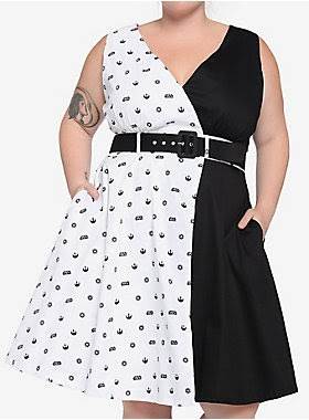 Can’t pick a favorite Star Wars series or movie? Celebrate the whole franchise! You and your young one can show your love for everything in the galaxy with this amazing black and white dress or a black T-shirt with yellow accents on the sleeves.